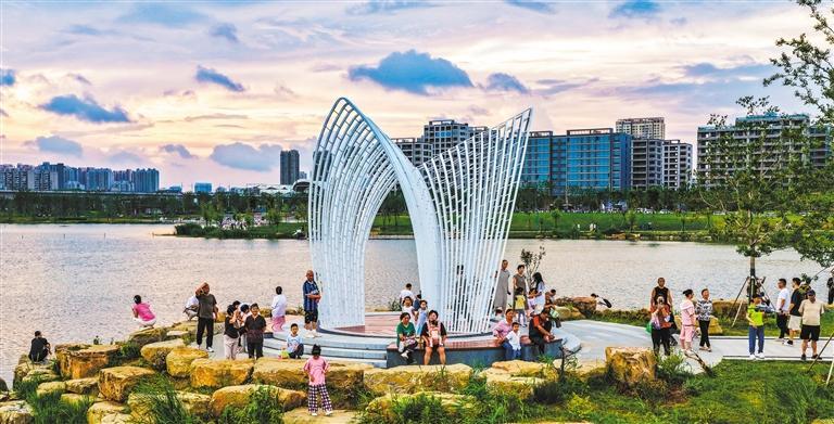 7月11日,市民在安徽省马鞍山市阳湖生态公园休闲散步。