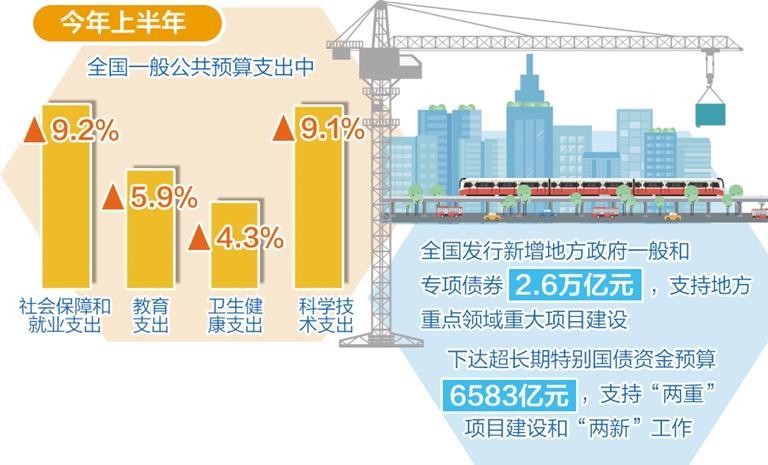 统计显示,上半年,全国一般公共预算支出中,社会保障和就业支出增长9.2%,教育支出增长5.9%,卫生健康支出增长4.3%,科学技术支出增长9.1%,住房保障支出增长2.2%,节能环保支出增长5.9%,文化旅游体育与传媒支出增长5%。