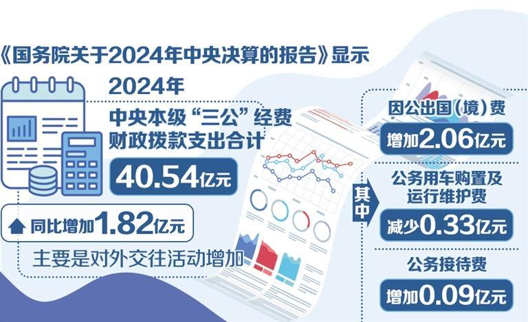 近日公布的《国务院关于2024年中央决算的报告》显示,2024年,中央本级“三公”经费财政拨款支出合计40.54亿元,比2023年增加1.82亿元,主要是对外交往活动增加。2024年中央本级“三公”经费整体上仍低于疫情前水平,比2019年决算数少8.2亿元。