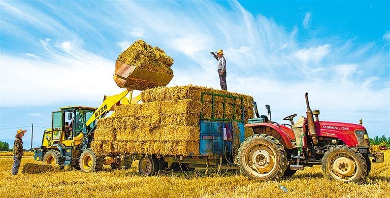 7月26日,甘肃省张掖市甘州区,村民驾驶农机装运小麦秸秆。“三夏”时节,当地加大秸秆回收力度,在保护环境的同时增加农户收入。杨永伟摄(中经视觉)