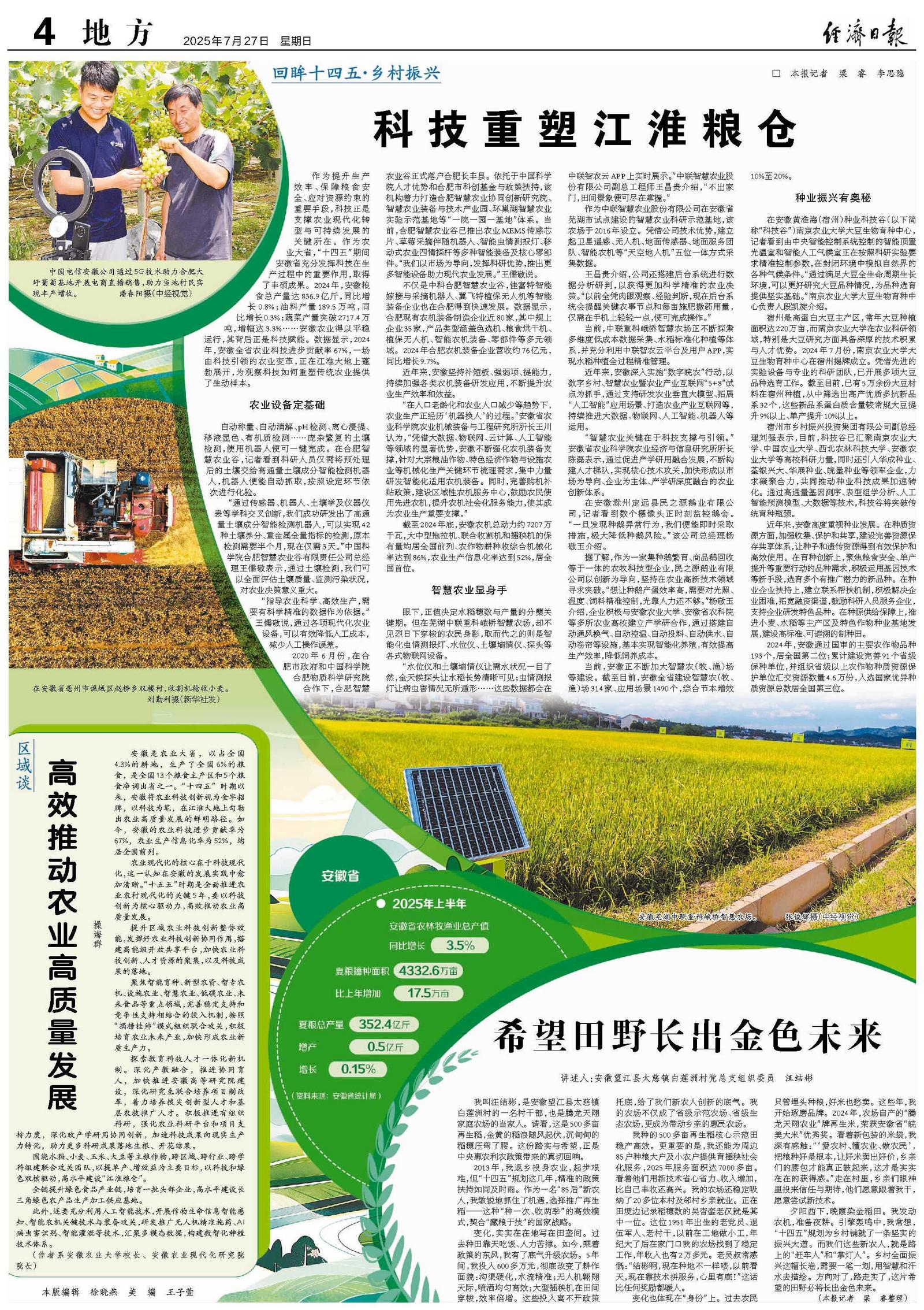 安徽是农业大省,以占全国4.3%的耕地,生产了全国6%的粮食,是全国13个粮食主产区和5个粮食净调出省之一。“十四五”时期以来,安徽将农业科技创新视为金字招牌,以科技为笔,在江淮大地上勾勒出农业高质量发展的鲜明路径。如今,安徽的农业科技进步贡献率为67%,农业生产信息化率为52%,均居全国前列。