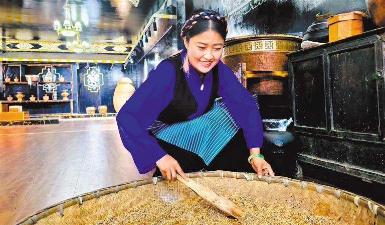 位于山南市琼结县的西藏琼结强钦青稞酒有限公司,讲解员在演示传统青稞酒酿造过程(摄于2024年11月)。