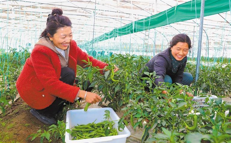 4月28日,农牧民在山南市西藏绿之源有机蔬果基地采摘辣椒。山南积极发展生态农牧产业,雅鲁藏布江北岸一带已从昔日的沙荒地变身设施农业园。