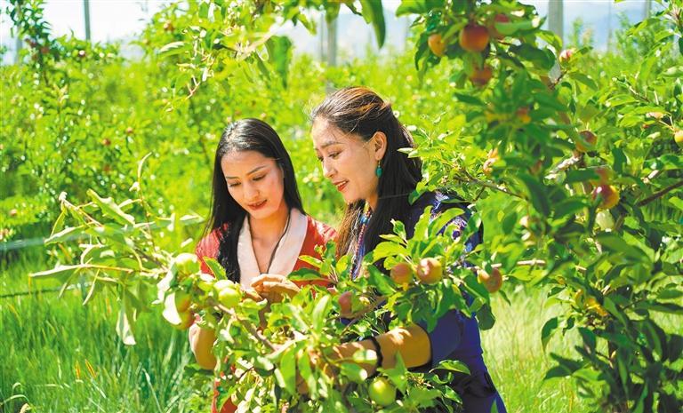 7月10日拍摄的山南市扎囊县扎其乡朗塞岭村苹果林。山南矮化苹果种植面积29800余亩,年产量3000吨。去年,首批60吨苹果出口尼泊尔,实现山南外贸出口零的突破。
