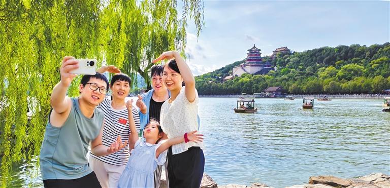 7月20日,北京市颐和园昆明湖畔,游客在拍照打卡。北京市不断加大颐和园的遗产保护工作,使其历史原貌得到最大程度延续。