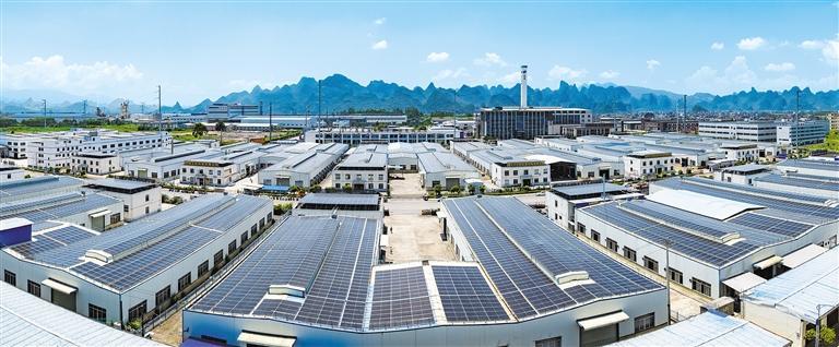 7月27日,在广西桂林市平乐县二塘镇工业集中区东区标准厂房屋顶,整齐排列的太阳能光伏板蔚为壮观。近年来,当地大力发展屋顶光伏项目,充分利用资源发展新能源,促进地方经济发展。