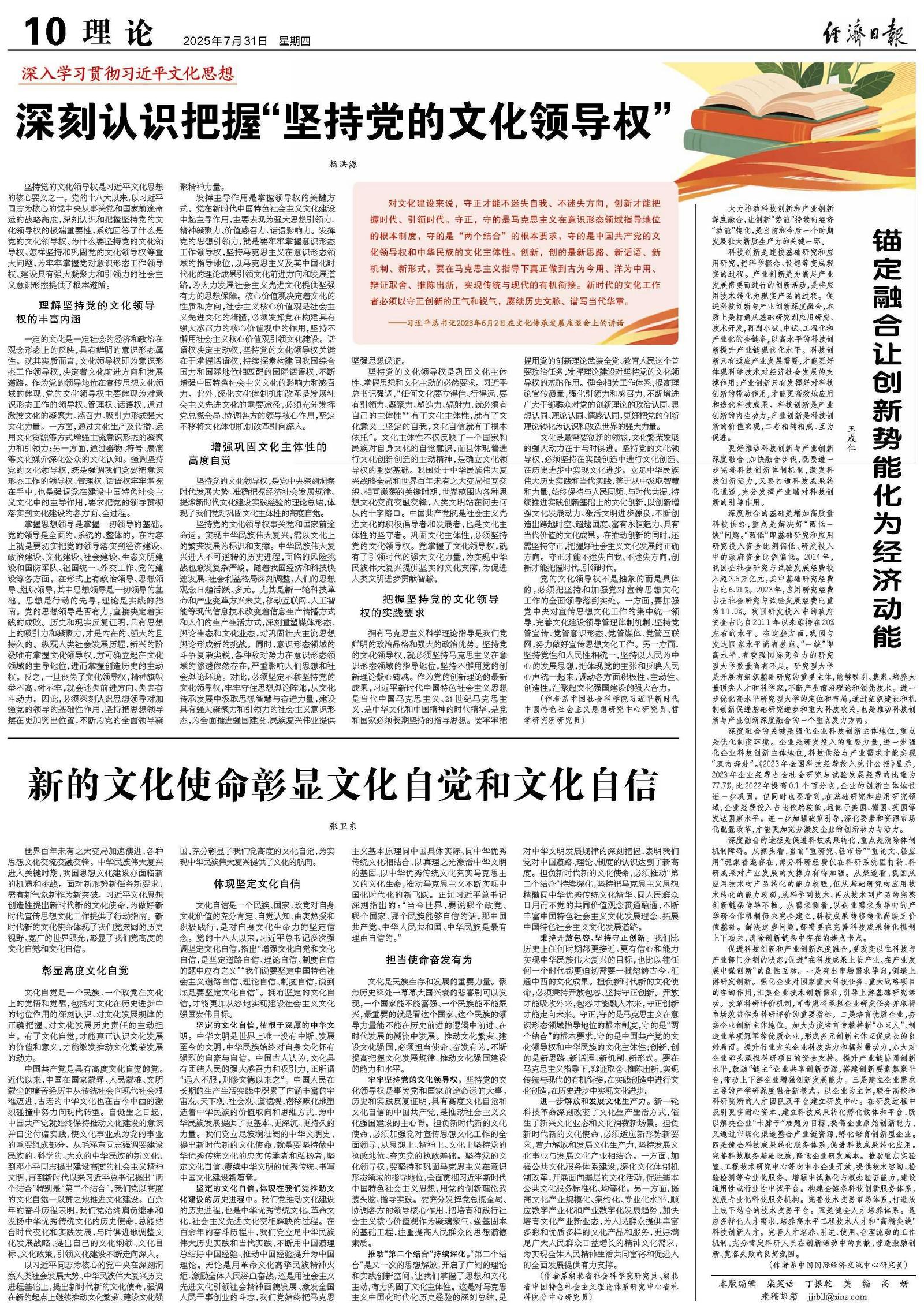 坚持党的文化领导权,是党中央深刻洞察时代发展大势、准确把握经济社会发展规律、提炼新时代文化建设实践经验的理论总结,体现了我们党对巩固文化主体性的高度自觉。