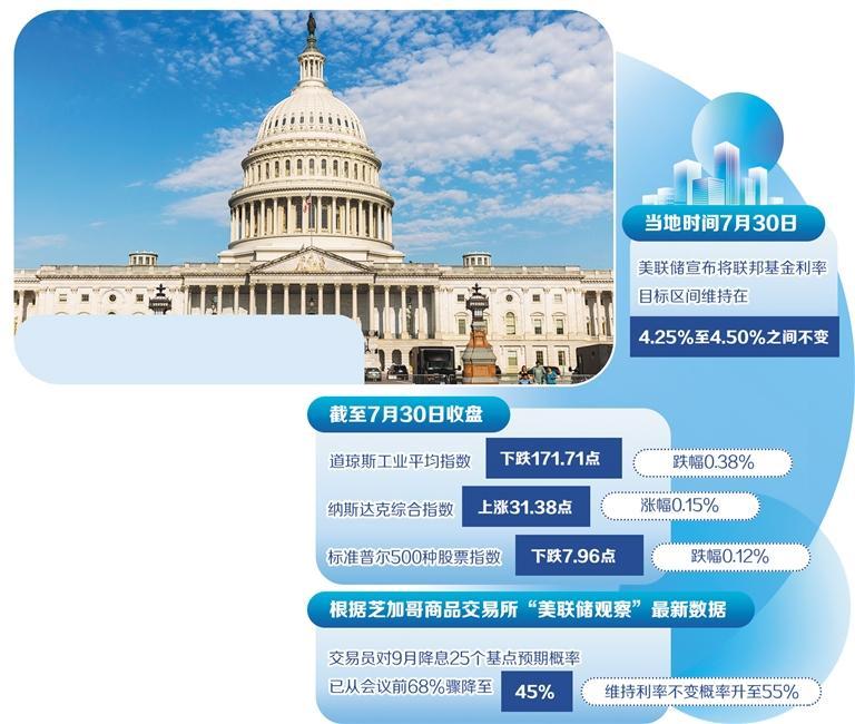 当地时间7月30日,美联储在结束为期两天的货币政策会议后宣布,将联邦基金利率目标区间维持在4.25%至4.50%之间不变。这是美联储货币政策会议连续第五次决定维持利率不变,符合市场预期。