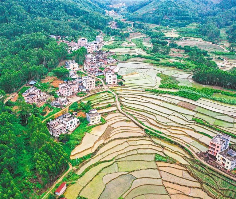 盛夏时节,广西岑溪市安平镇凤新村,青山环抱刚刚插完晚稻秧苗的梯田,构成一幅绿色生态乡村画卷。颜桂海摄(中经视觉)