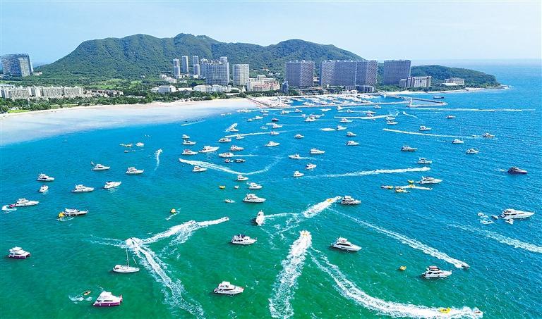 8月3日,海南省三亚市半山半岛海域游艇、摩托艇穿梭如织。今年暑期,多地发布高温预警,而处于海洋气候地区的海南相对凉爽,在三亚的游客纷纷乘坐游艇出海消暑。叶龙斌摄(中经视觉)