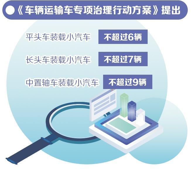 “在治理目标上,实行车辆和装载双合规。”交通运输部运输服务司副司长高博介绍,此次行动方案发布了合规车辆运输车、合规装载示意图。一般情况下,平头车装载小汽车不超过6辆,长头车装载小汽车不超过7辆,中置轴车装载小汽车不超过9辆。