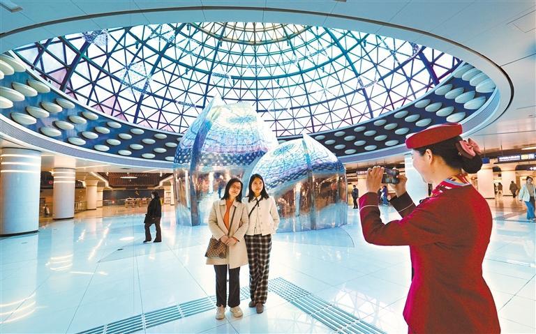 3月21日,游客在被誉为“武汉地铁最美车站”的湖北省武汉商务区站打卡。截至2024年底,我国共有54个城市开通运营城市轨道交通线路325条,车站6324座。产启斗摄(中经视觉)