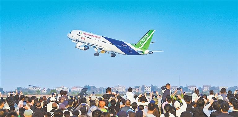 在江西省南昌市拍摄的中国商飞国产大飞机C919。科技创新正日益成为我国交通运输领域的重要驱动力(摄于2024年11月2日)。