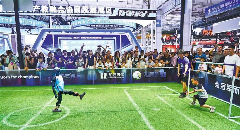 8月8日,2025世界机器人大会在北京经济技术开发区开幕。大会由中国电子学会、世界机器人合作组织主办,全球200多家企业携1500余件展品参展。这是小朋友与机器人进行足球比赛。本报记者 赵 晶摄