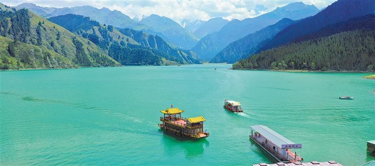 8月7日拍摄的新疆维吾尔自治区昌吉回族自治州阜康市天池景区。早秋时节,天池景区风景如画,吸引许多游客前来游玩。