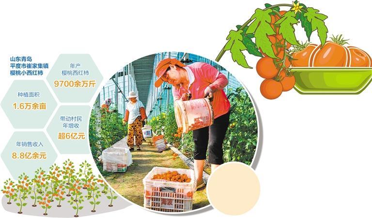 通过探索种植体系化、管理体系化、品牌体系化路径,目前,崔家集镇樱桃小西红柿设施栽培大棚总数发展到2600余座,种植面积1.6万余亩,年产樱桃西红柿9700余万斤,年销售收入8.8亿余元,带动村民年增收超6亿元。凭借这一股红色“柿”力,崔家集镇成功获评第十二批全国“一村一品”示范村镇、2022年全国乡村特色产业超10亿元镇。