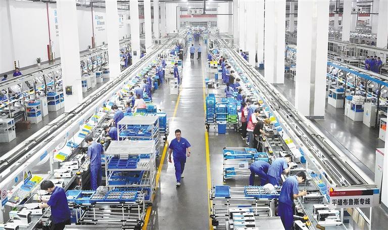 位于浙江台州的杰克科技股份有限公司是一家从家用缝制设备起家的民营企业,通过不断的科技创新、专利积累、国际化并购等,成为全球智能化服装装备行业的领军者。图为公司台州湾工厂,工人在生产线上工作。