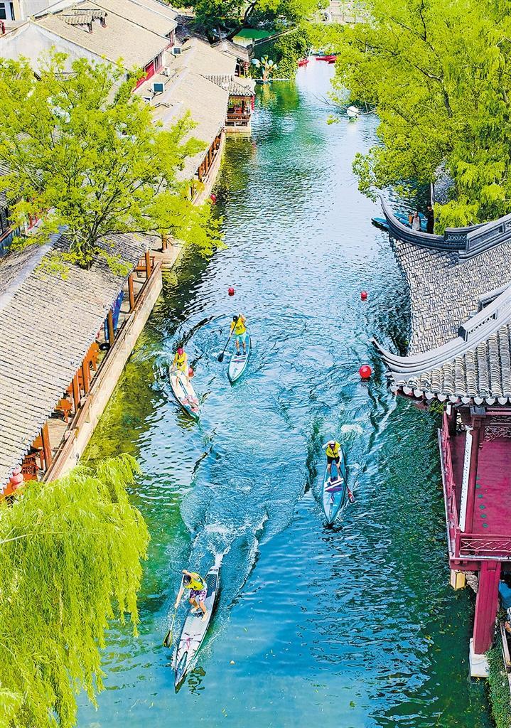 8月9日,桨板选手在江苏苏州周庄古镇水道上挥桨竞渡。近年来,苏州通过举办大众体育联赛,促进地方体育与文化、旅游深度融合,激发文旅产业新活力。袁新宇摄(中经视觉)