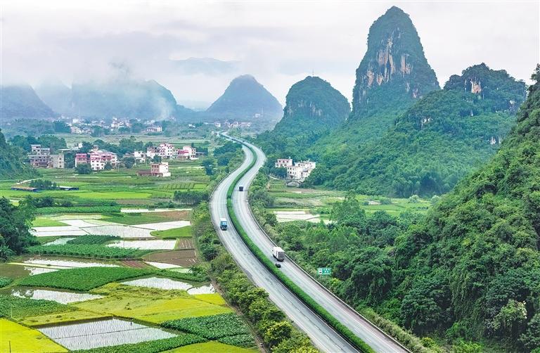 8月8日,在广西壮族自治区贺州市平桂区鹅塘镇,公路与田园、民居、山峦相映成景。近年来,当地持续推进交通基础设施建设,便捷的交通路网改善了群众出行条件,为发展乡村旅游产业和推动乡村全面振兴提供了强劲动力。