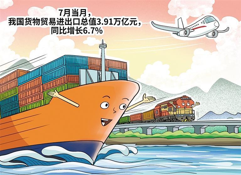 海关总署近日发布的数据显示,7月当月,我国货物贸易进出口总值3.91万亿元,同比增长6.7%,增速比6月加快1.5个百分点,创年内新高。其中,前7个月,我国进出口高技术产品5.1万亿元,增长8.4%,对同期我国整体进出口增长的贡献率为45.4%。今年以来,随着“两重”“两新”等政策持续发力,我国外贸运行保持向上向好势头,成绩喜人。接下来,推动外贸量质齐升,还应多方协同发力,持续推动产业链升级,通过自贸协定深化区域合作,打造“研发+制造+运维”新型贸易链。加快数字贸易发展,推广电子提单、海外仓等数字化工具。扩大出口信用保险覆盖,建立汇率避险补贴机制。同时,探索监管创新,努力形成制度型开放优势。(时 锋)