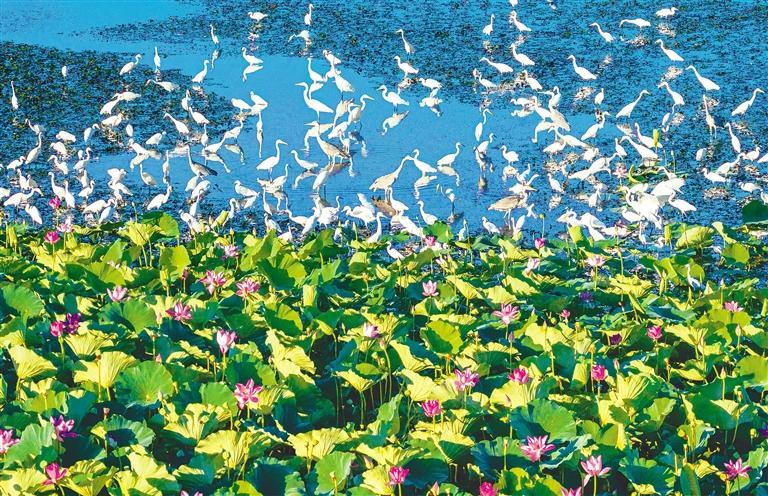 8月16日,江苏泗洪洪泽湖湿地临淮段荷花绽放,大批白鹭在此栖息、觅食。近年来,当地狠抓湿地生态修复与保护,生物多样性持续丰富,鸟类种群数量从194种增至240种,生态保护成效显著。张连华摄(中经视觉)