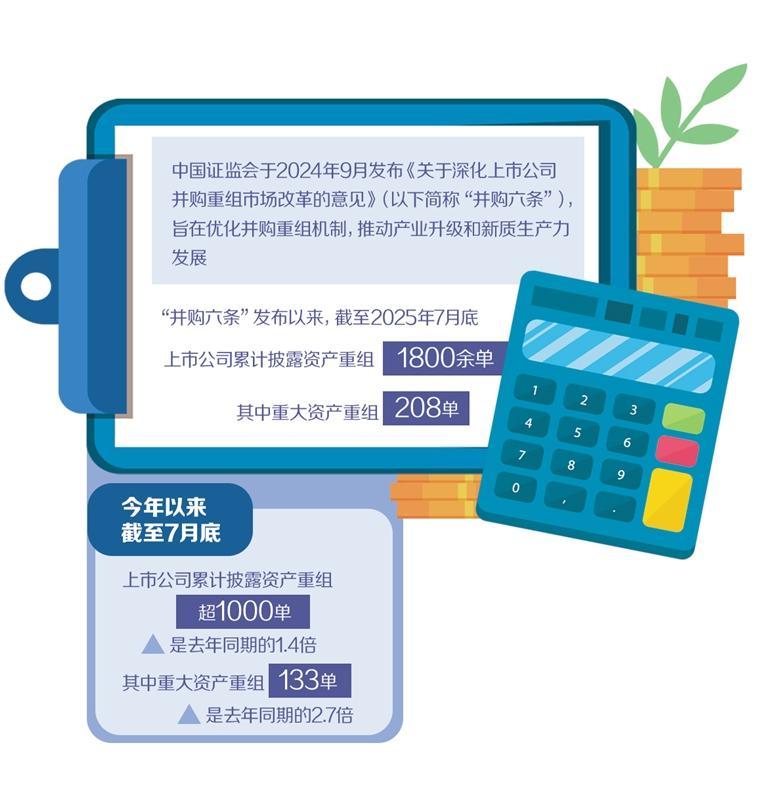 中国证监会于2024年9月发布《关于深化上市公司并购重组市场改革的意见》(以下简称“并购六条”),旨在优化并购重组机制,推动产业升级和新质生产力发展。“并购六条”发布以来,截至2025年7月底,上市公司累计披露资产重组1800余单,其中重大资产重组208单。今年以来,截至7月底,上市公司累计披露资产重组超1000单,是去年同期的1.4倍,其中重大资产重组133单,是去年同期的2.7倍。