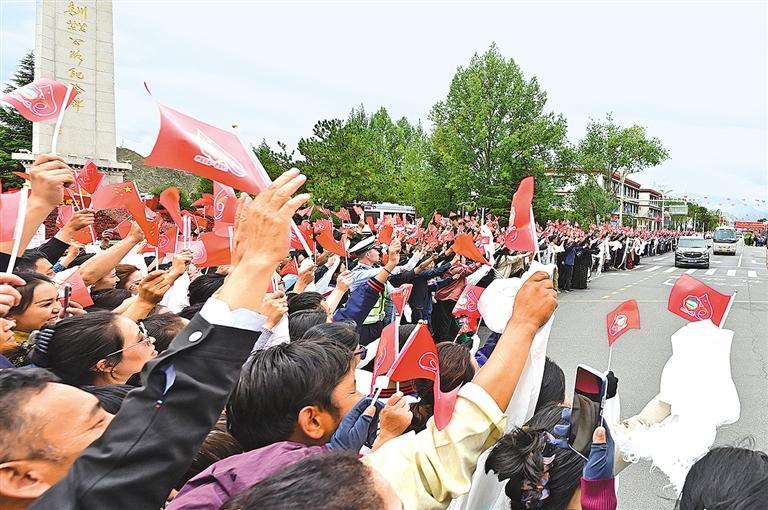 图③ 8月20日中午,中共中央总书记、国家主席、中央军委主席习近平率中央代表团乘专机抵达拉萨,出席西藏自治区成立60周年庆祝活动。习近平等从机场乘车到住地途中,各族群众在街道两旁热情欢迎。