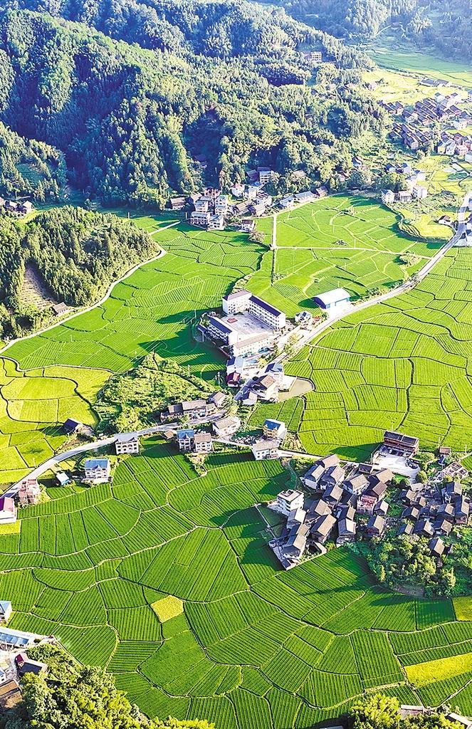 八月二十二日,湖南省怀化市通道侗族自治县菁芜洲镇龙坪村,稻田、道路与民居勾勒出一幅静谧丰饶的乡村画卷。石猛雷摄(中经视觉)