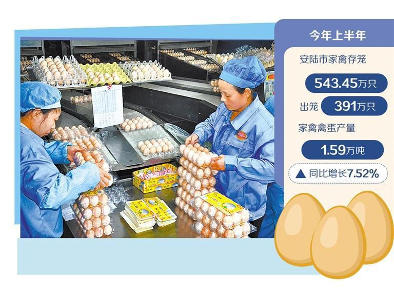 安陆是全国重要的蛋品加工基地,是湖北省唯一获评全国“一县一业”蛋鸡产业示范样板的县市,也是全省唯一拥有“国字号”家禽新品种的县市。得益于科技加持、深加工延链补链,禽蛋产业链实现了从低端到中高端的跃升。今年上半年,全市家禽存笼543.45万只,出笼391万只,家禽禽蛋产量1.59万吨,同比增长7.52%。