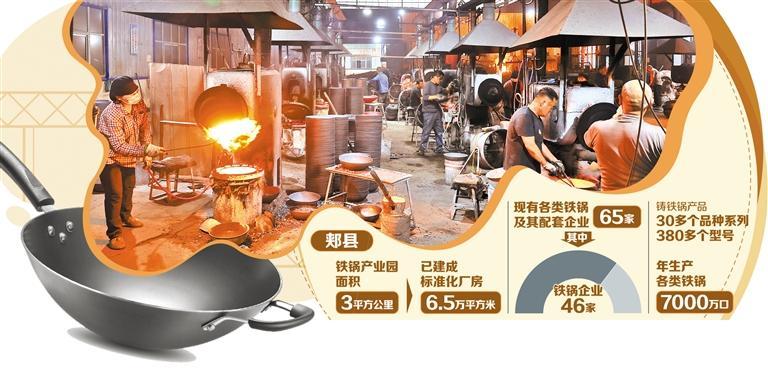 如今,郏县铸铁锅产业已形成强大的集群效应。郏县铁锅产业园现有各类铁锅及配套企业65家,其中铁锅企业46家。铸铁锅产品有30多个品种系列380多个型号,年生产各类铁锅7000万口,占全国铸铁锅产量的70%。当地已形成了从原材料供应、制模、熔炼、压铸、抛光、氮化、装配研发到销售、物流的完整产业链,产品远销30多个国家和地区。产业的勃兴,深刻改变了当地的经济社会面貌。目前,铸铁锅产业直接带动当地约1.5万人就业,已成为郏县重要的支柱产业和富民产业。