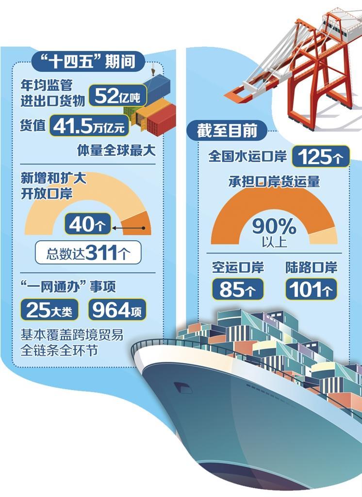 年均监管进出口货物52亿吨、货值41.5万亿元,体量全球最大;新增和扩大开放口岸40个、总数达311个;“一网通办”事项达25大类964项,基本覆盖跨境贸易全链条全环节……在国务院新闻办25日举行的“高质量完成‘十四五’规划”系列主题新闻发布会上,一系列海关高质量发展数据亮眼。