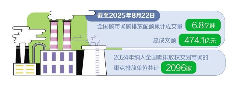 从全国碳排放权交易市场来看,截至2025年8月22日,全国碳市场碳排放配额累计成交量6.8亿吨,总成交额达474.1亿元,价格“指挥棒”作用逐步显现。2024年纳入全国碳排放权交易市场的重点排放单位共计2096家,配额清缴完成率接近100%。