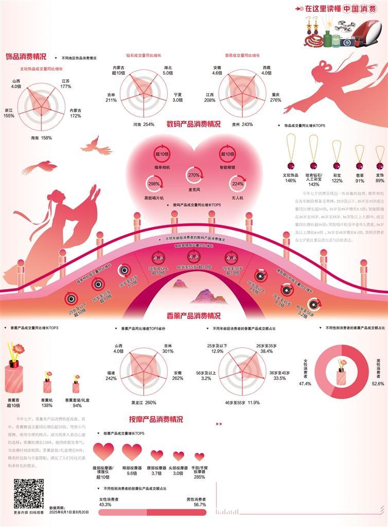 今年七夕节前,消费市场热度不仅体现在各类商品成交量攀升,更折射出人们情感表达的多元与升级。从数码、香薰到健康产品的消费数据看,七夕消费正突破传统框架,走向更注重体验、个性与关怀的新方向。