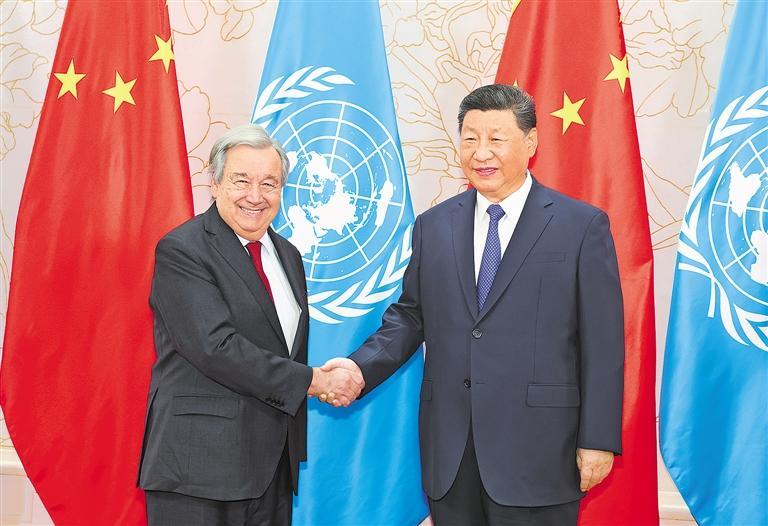 古特雷斯表示,感谢中国长期以来对联合国坚定有力的支持。当前,多边主义、国际法、联合国权威面临挑战,国际治理架构急需改革,重温80年前成立联合国的初心和价值理念正当其时。中国为维护国际法、确保国际法治作出重要贡献,成为捍卫多边主义的基石。联合国愿加强同中方的合作,维护联合国宪章宗旨和原则,捍卫国际关系基本准则,推进世界多极化,提高发展中国家的代表性,让联合国在国际事务中发挥更大作用。双方要加强在全球治理体系改革、人工智能、应对气候变化挑战等方面的合作,以更好服务人类共同福祉。