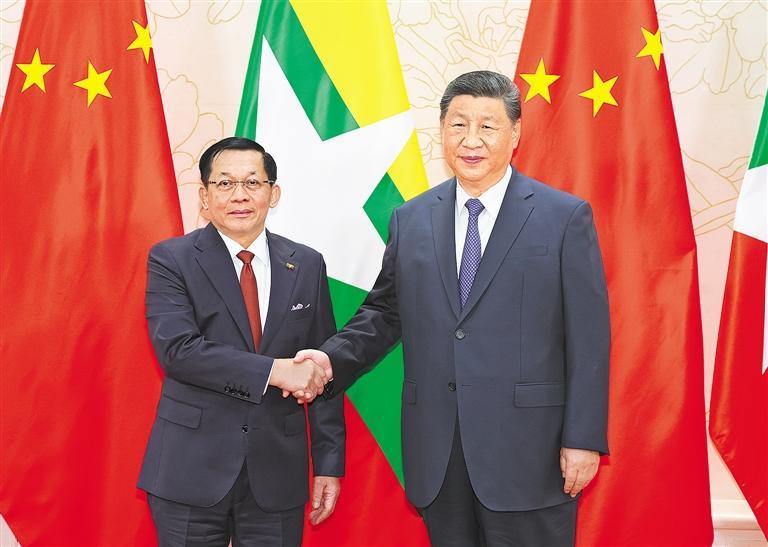 习近平指出,缅甸是世界反法西斯战争东方战场的组成部分,是上海合作组织重要对话伙伴。中缅胞波情谊植根于人民,历久弥新。双方要以中缅建交75周年为契机,深化战略合作,加快推进命运共同体建设,给两国人民带来更多福祉。