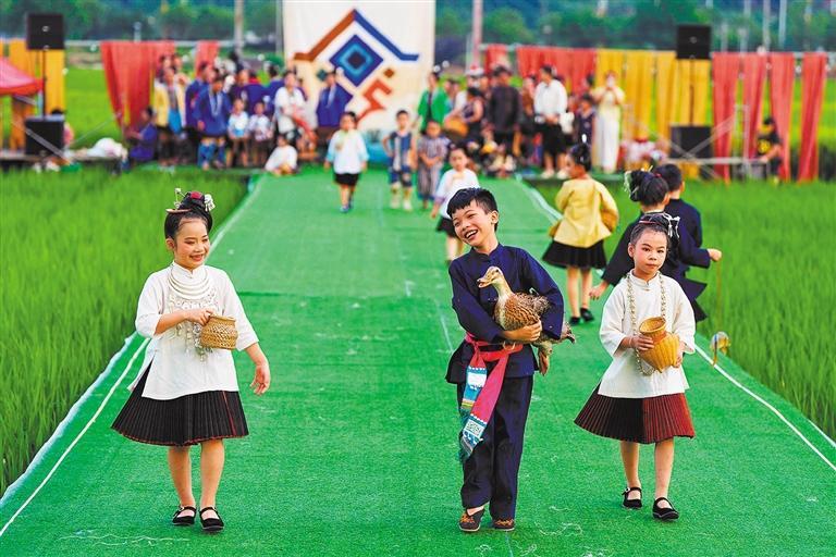 8月8日,在贵州省榕江县车江大坝,一场稻田间的民族服装秀吸引游客前来观赏。