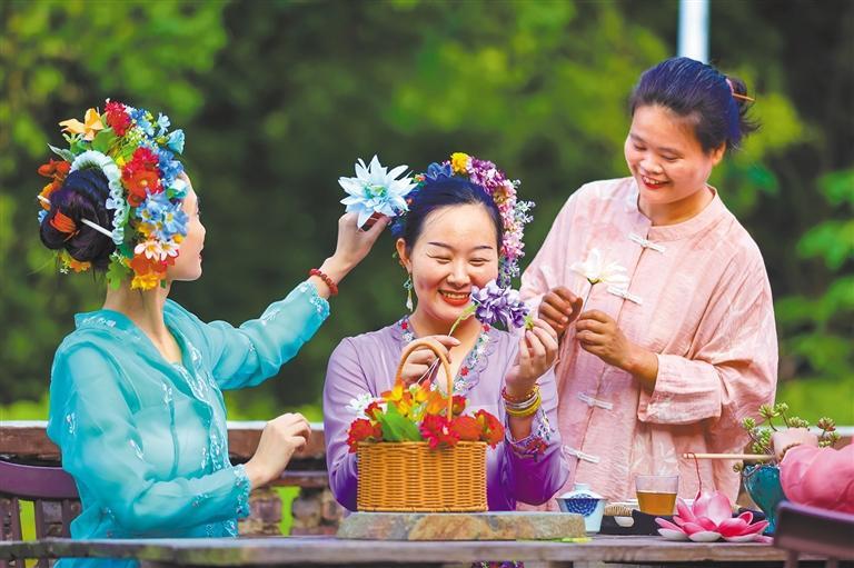 8月17日,福建省南安市金淘镇一家闽南古厝共享茶室,游客身着民俗服饰,体验非遗簪花技艺。谢贵明摄(中经视觉)