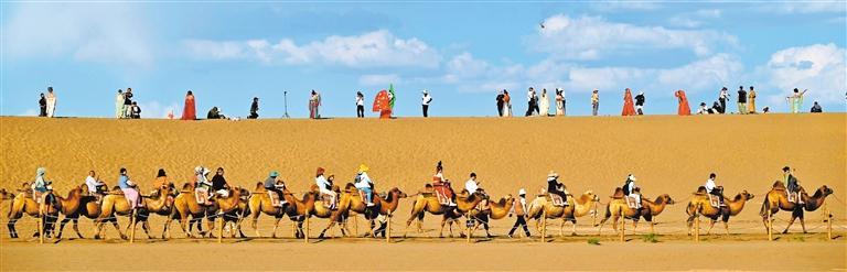 8月27日,游客在甘肃省敦煌市鸣沙山月牙泉景区游览。张晓亮摄(中经视觉)