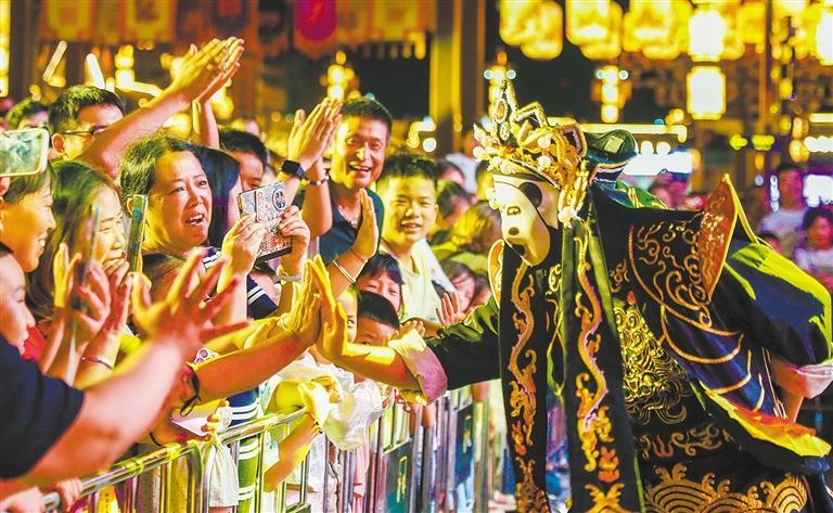 8月18日,在四川省广元市剑阁县“大蜀道不夜三国城”,川剧演员与游客互动。近年来,该县打造的夜间文旅消费集聚区受到游客欢迎。游 青摄(中经视觉)