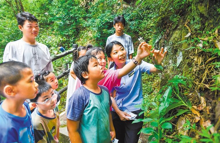 8月11日,江西省宜春市靖安县三爪仑国家森林公园,江西九岭山国家级自然保护区管理局的自然教育讲师向参加研学的青少年科普植物的生长习性与生态保护的重要意义。
