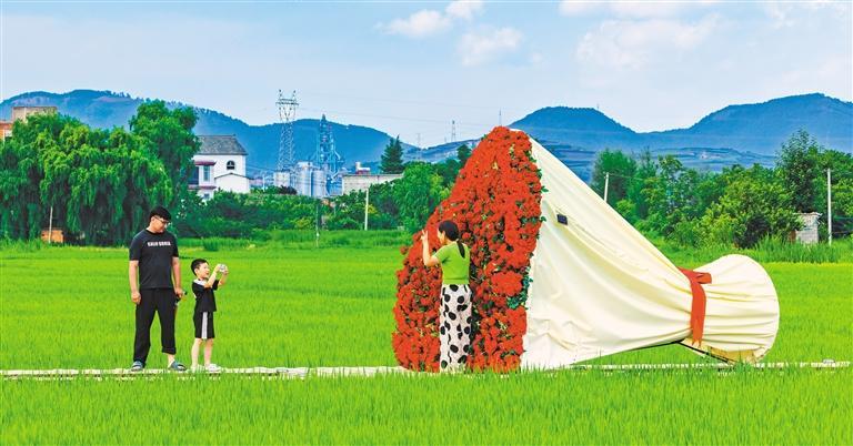 7月30日,游客在云南省昭通市鲁甸县桃源回族乡万亩稻田观光园游玩。当地通过举办农耕体验、稻田集市、亲子研学等活动丰富游客体验。张 波摄(中经视觉)