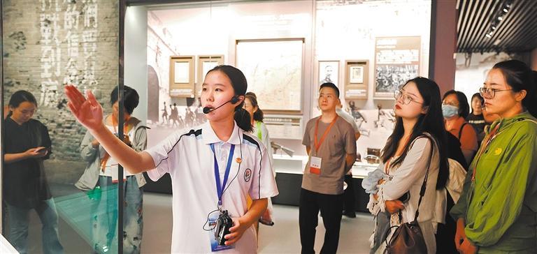 8月27日,来自北京市昌平区第二中学的李坤妮带领观众重温烽火岁月。目前,该馆共有十余位学生志愿者为观众提供讲解服务。本报记者 高兴贵摄