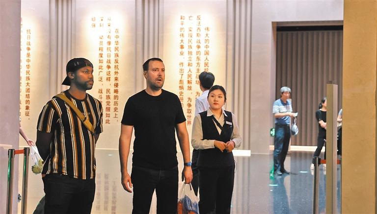 8月27日,来自加拿大的外国游客在参观主题展览。