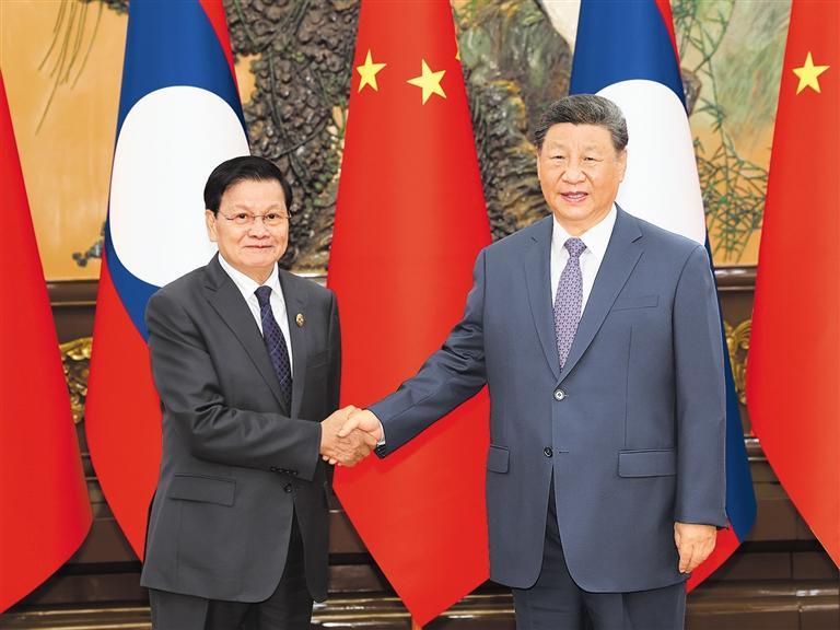 习近平强调,当前国际和地区形势发生复杂深刻变化,双方要以长远眼光和战略思维看待和把握中老关系,在涉及彼此核心利益和重大关切问题上坚定相互支持。要以明年两国建交65周年为契机,谋划开展好各领域交往。中方愿同老方深化治党治国经验交流,支持老挝人民革命党筹备和开好十二大。要以中老铁路运营和沿线开发为抓手,持续拓展“黄金大通道”辐射带动效应,推动重点项目提质升级。要深化防务、执法安全等合作,对跨境赌博、电信网络诈骗犯罪等持续高压严打。中方祝贺老挝成为上海合作组织对话伙伴,愿同老方在中国东盟合作、澜湄合作、东亚峰会等地区机制下深化协调和配合,促进地区和平与发展。