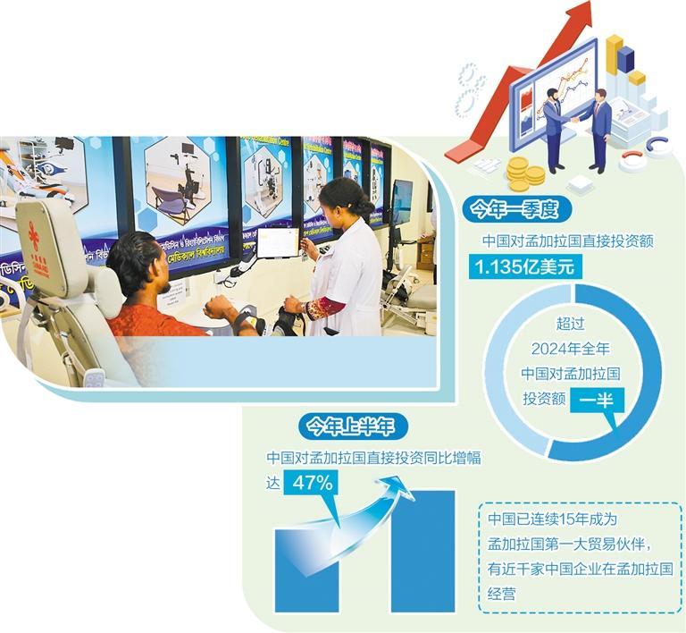 数据显示,2025年以来,中国对孟加拉国投资呈现出快速增长势头。今年一季度,中国对孟加拉国直接投资额达到1.135亿美元,超过了2024年全年中国对孟加拉国投资额的一半。今年上半年,中国对孟加拉国的直接投资同比增幅高达47%。中国投资在孟加拉国制造业升级、基础设施现代化以及能源转型等多个领域发挥了重要作用,为孟加拉国的经济发展注入了新的动力,深化了两国经贸关系。