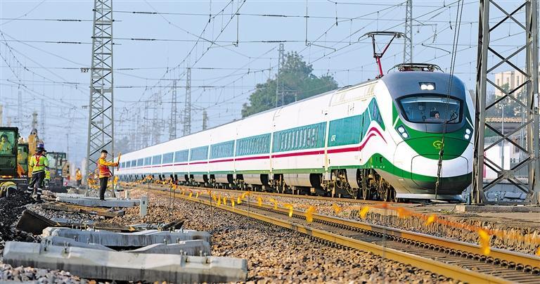 9月13日,中国铁路郑州局集团有限公司郑州桥工段职工利用210分钟施工“天窗”,对京广铁路新郑站下行进行机械化轨枕更换作业。图为职工在立岗迎车。曹 源摄(中经视觉)