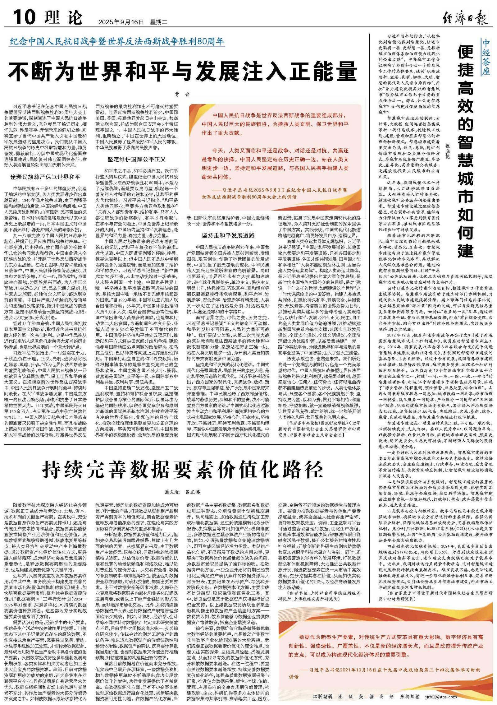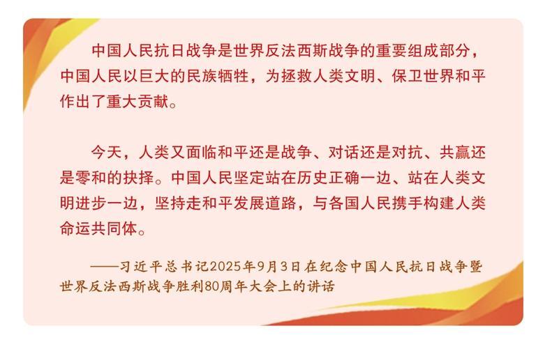 习近平总书记在纪念中国人民抗日战争暨世界反法西斯战争胜利80周年大会上的重要讲话,深刻阐述了中国人民抗日战争胜利的伟大意义,充分彰显了铭记历史、缅怀先烈、珍爱和平、开创未来的鲜明立场,明确宣示了当代中国共产党人引领中国走和平发展道路的坚定决心。我们要从中国人民抗日战争的历史中汲取智慧和力量,踔厉奋发、勇毅前行,为以中国式现代化全面推进强国建设、民族复兴伟业而团结奋斗,推动人类发展巨轮驶向更加光明的未来。