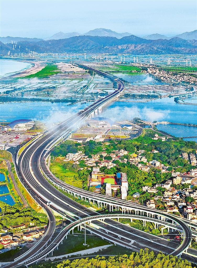 10月3日,广东省汕尾市红草镇新村村,沈海高速公路上疾驰的车辆与周边农房、鱼塘、农田相映成景。近年来,广东省汕尾市立足交通先行,服务乡村振兴,形成高速铁路、高速公路、国省干道、农村公路相结合的交通网络体系。