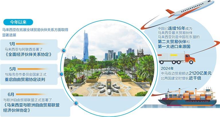 今年以来,马来西亚在拓展全球贸易伙伴关系方面取得了显著进展,重启了与欧盟、海湾合作委员会国家以及韩国的贸易谈判。今年1月,马来西亚与阿联酋签署了《全面经济伙伴关系协定》;6月,马来西亚与欧洲自由贸易联盟正式签署了《马来西亚与欧洲自由贸易联盟经济伙伴协定》。这些协定为马来西亚的产品和服务打开了更广阔的市场,提供了更优惠的市场准入条件。值得一提的是,马来西亚于2025年1月1日正式成为金砖伙伴国之一。5月,安瓦尔带领贸易代表团访问俄罗斯,进一步深化了与金砖国家的合作。