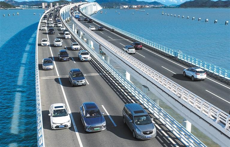 10月7日,在浙江省舟山市普陀区,返程车辆行驶在朱家尖海峡大桥上(无人机照片)。邹训永摄(新华社发)